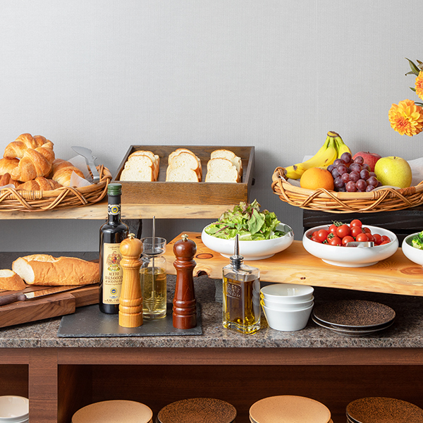 Seasonal drinks and light foods are available at our exclusive lounge. In the evening, enjoy a glass of wine and other alcoholic beverages from the self-service open bar. Background music playing from Bose speakers further invites you to relax and unwind.